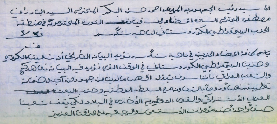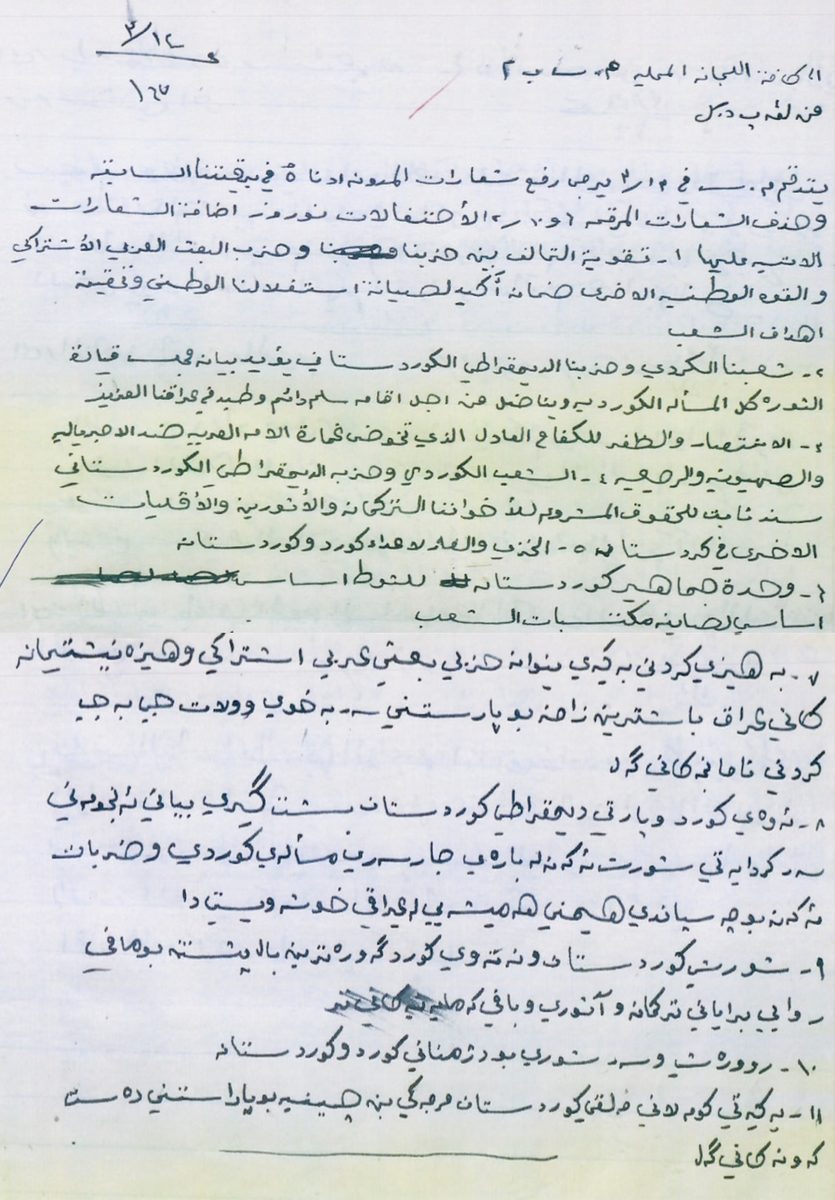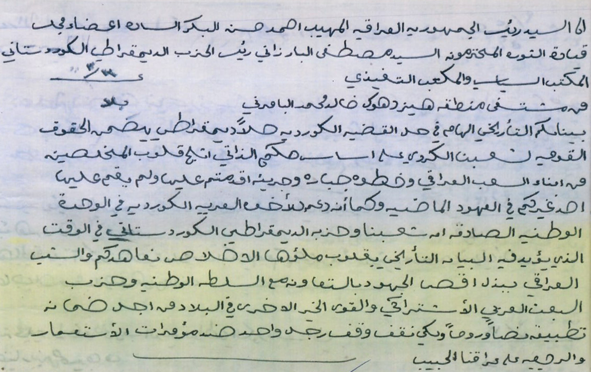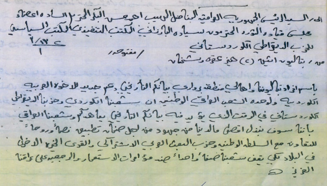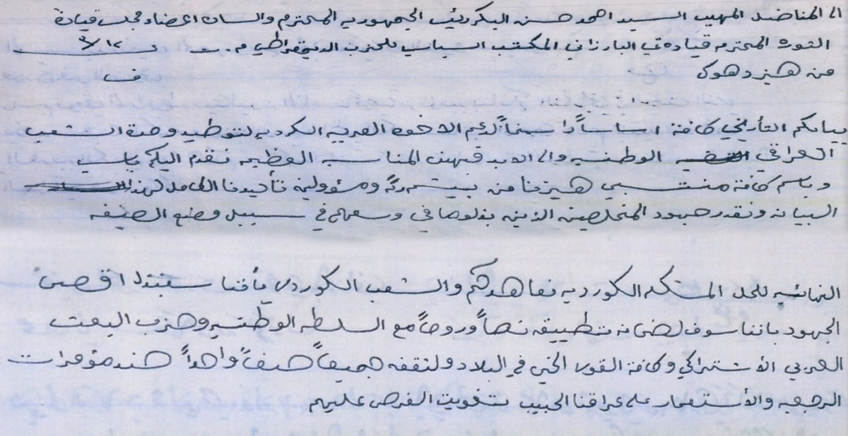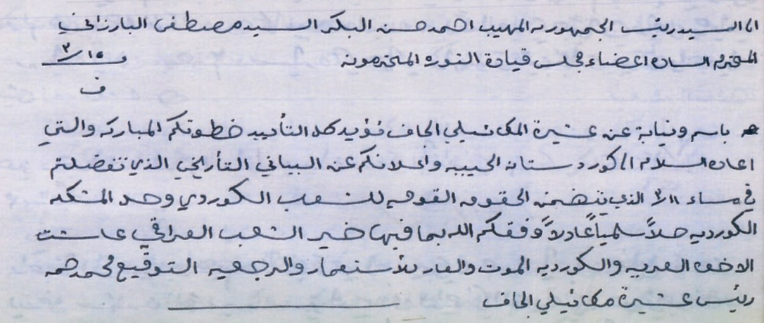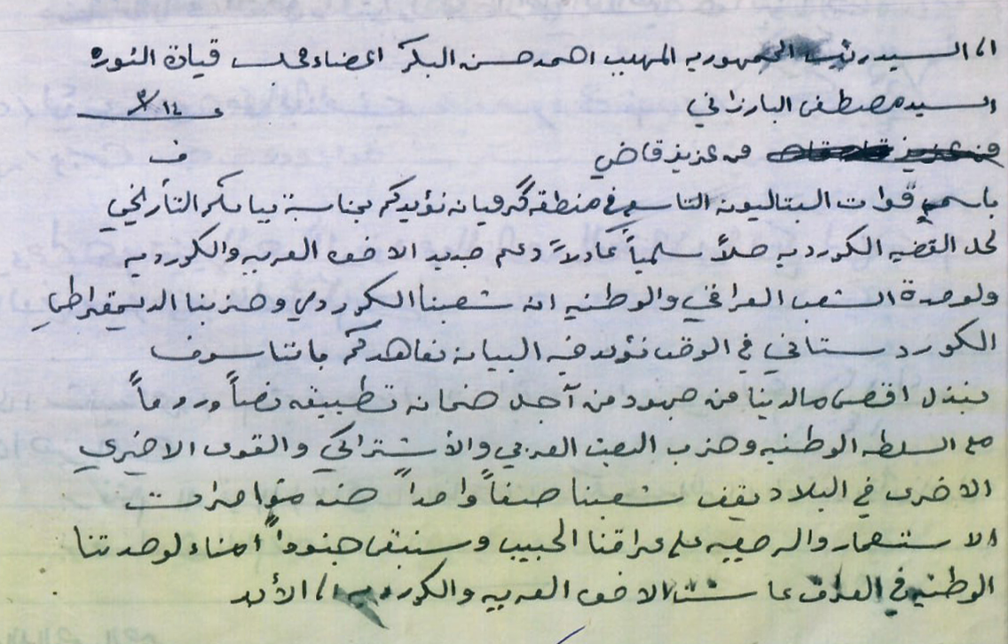 بەڕێز سەرۆک کۆماری عێراق شکۆدار/ ئەحمەد حەسەن بەکر، بەڕێزان ئەندامانی ئەنجومەنی سەرکردایەتی شۆڕش، بەڕێز مستەفا بارزانی سەرۆکی پارتی دیموکراتی کوردستان، مەکتەبی سیاسی و مەکتەبی تەنفیزى.