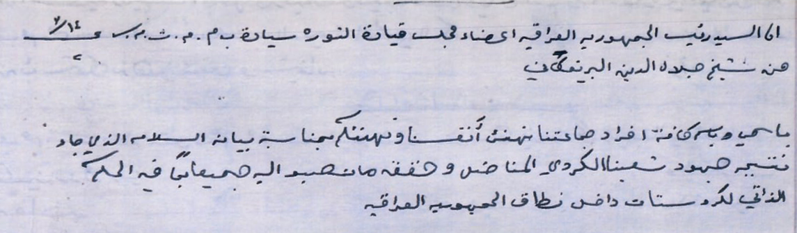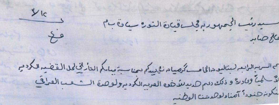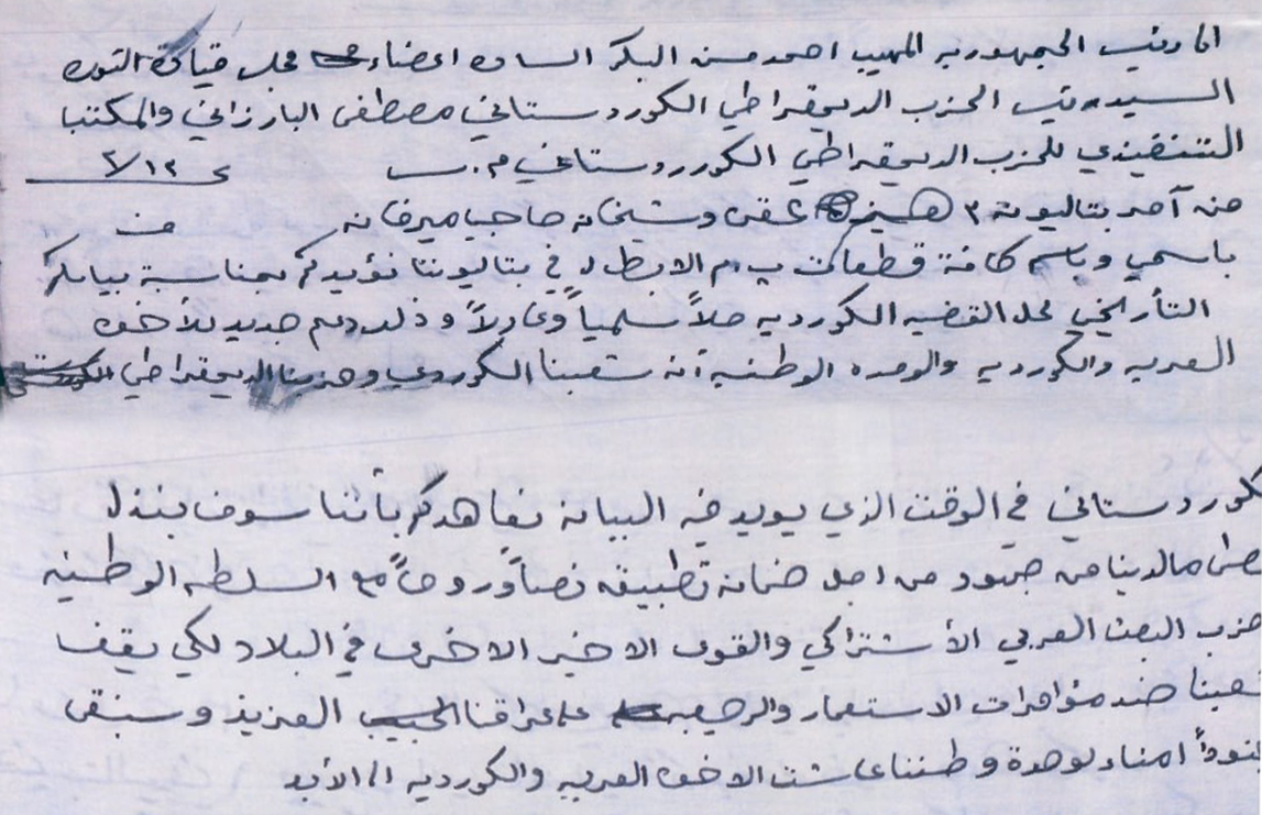 بەڕێز سەرۆک کۆماری عێراق خەباتگێڕ و شکۆدار/ ئەحمەد حەسەن بەکر، بەڕێزان ئەندامانی ئەنجومەنی سەرکردایەتی شۆڕش، بەڕێز بارزانی، مەکتەبی تەنفیزى، مەکتەبی سیاسی پارتی دیموکراتی کوردستان.