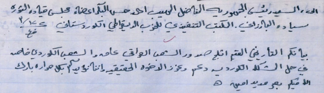 خەباتگێڕ شکۆدار بەڕێز/ ئەحمەد حەسەن بەکر سەرۆک کۆمار و بەڕێزان ئەندامانی ئەنجومەنی سەرکردایەتی، و سەرکردایەتی بارزانی، مەکتەبی سیاسی پارتی دیموکراتی کوردستان، م.ت